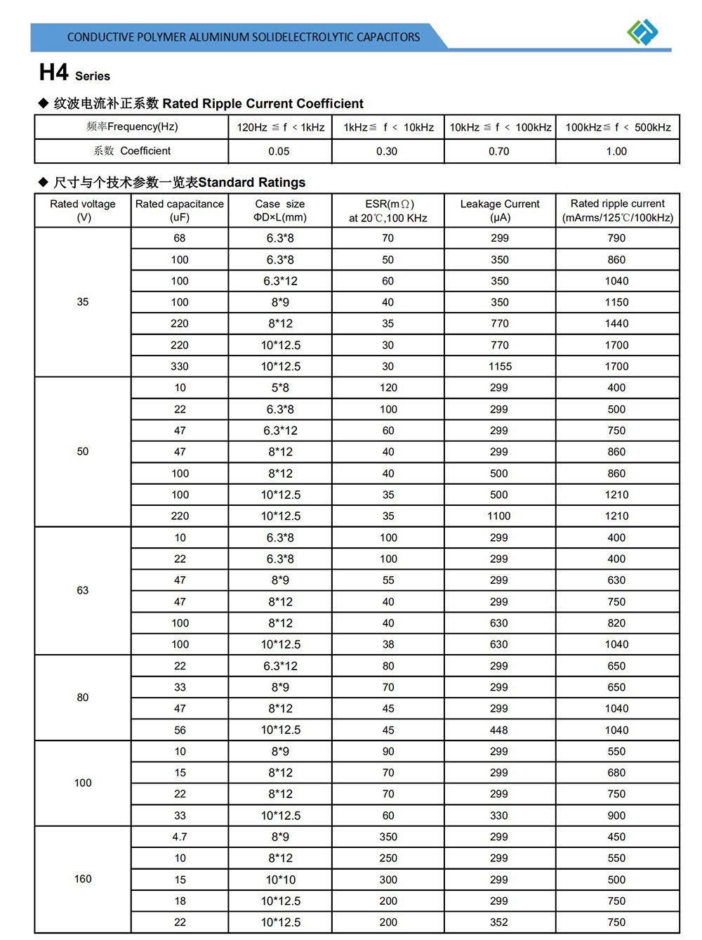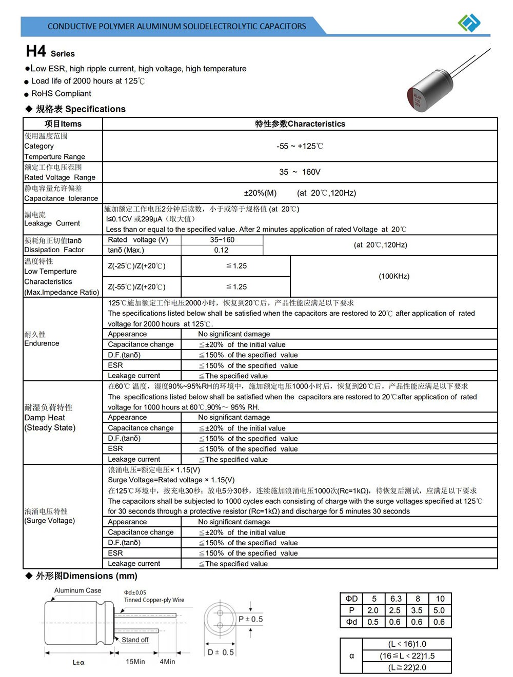 ● Low ESR, high ripple current, high voltage, high temperature ● Load life of 2000 hours at 125℃ ● RoHS Compliant