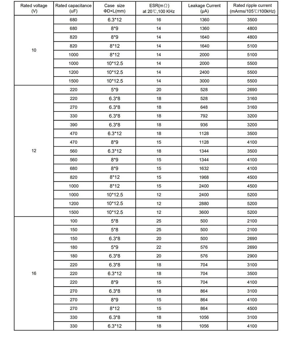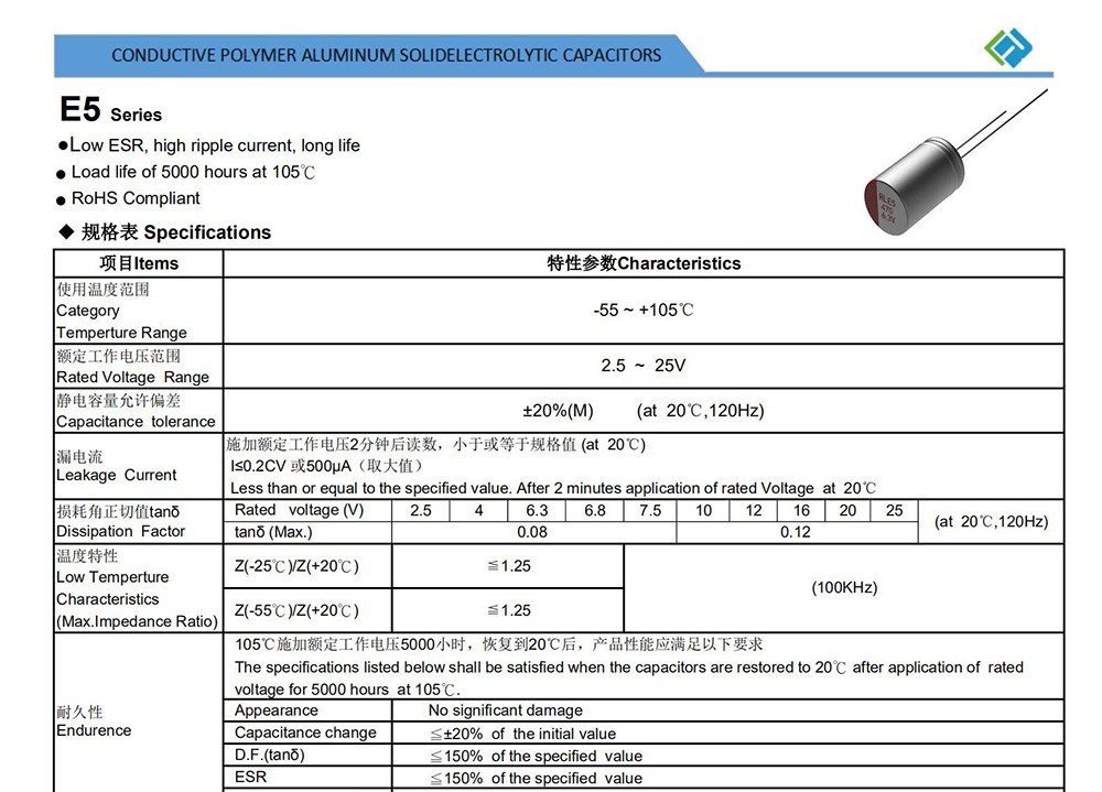 ● Low ESR, high ripple current, long life ● Load life of 5000 hours at 105℃ ● RoHS Compliant