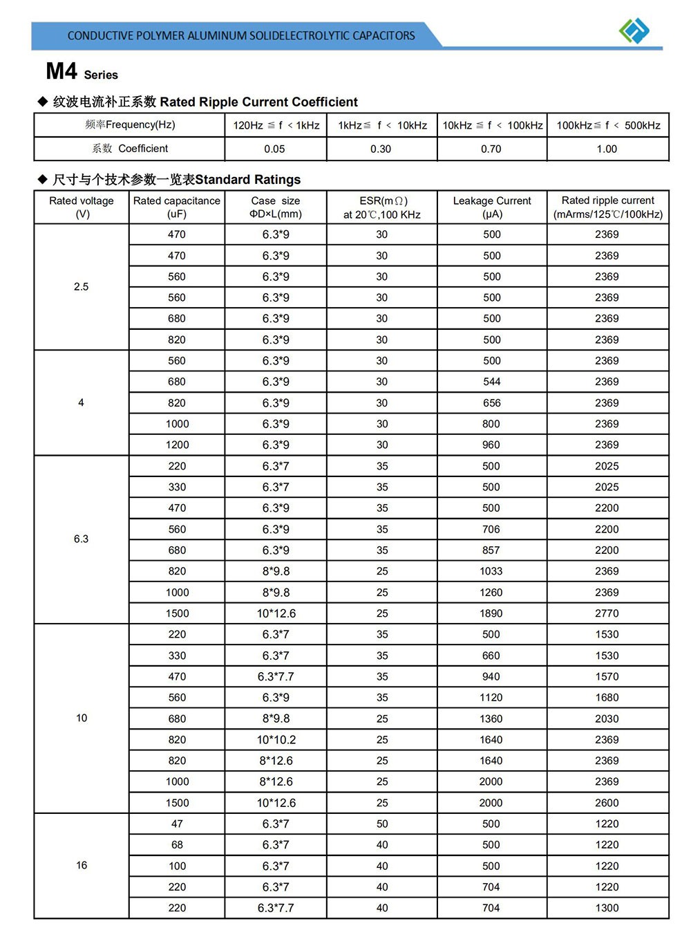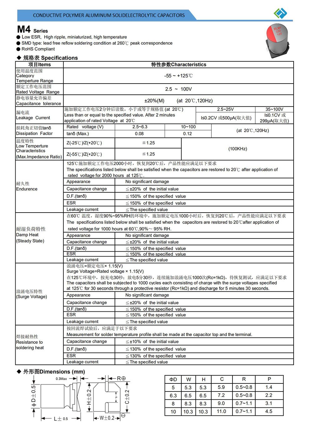 ● Low ESR, High ripple, miniaturized, high temperature ● SMD type: lead free reflow soldering condition at 260℃ peak correspondence ● RoHS Compliant